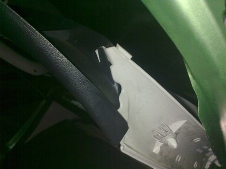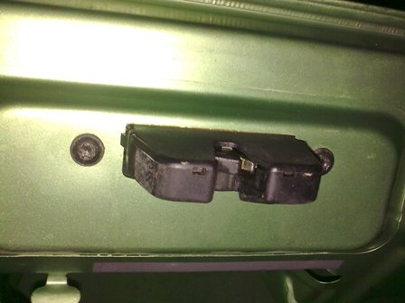 A műanyag burkolaton túlvagyunk, előtűnik a nyitóegység. 10-es kulccsal a két tartóanyát leszedjük és felfelé ki tudjuk nyomni az egységet.